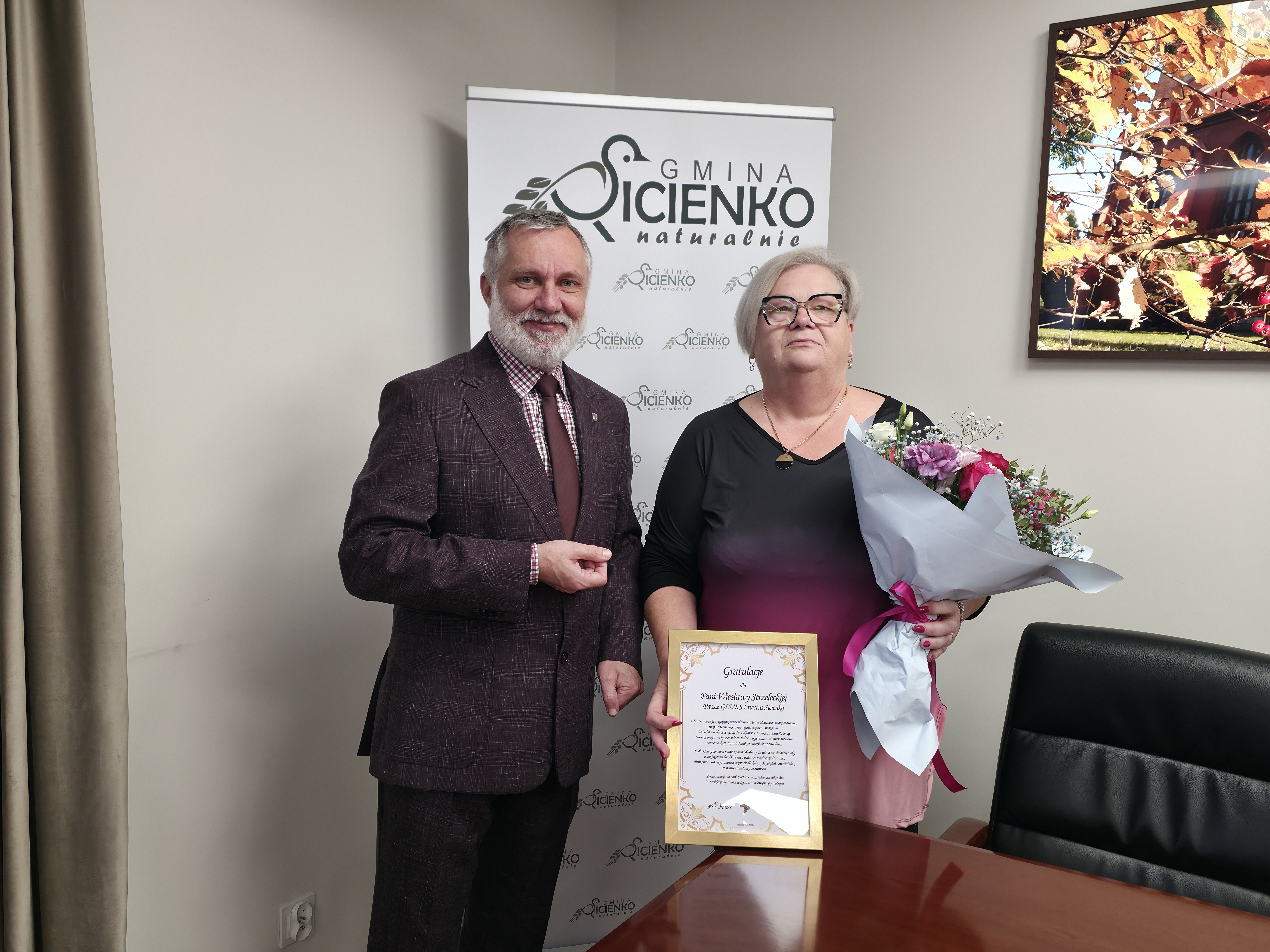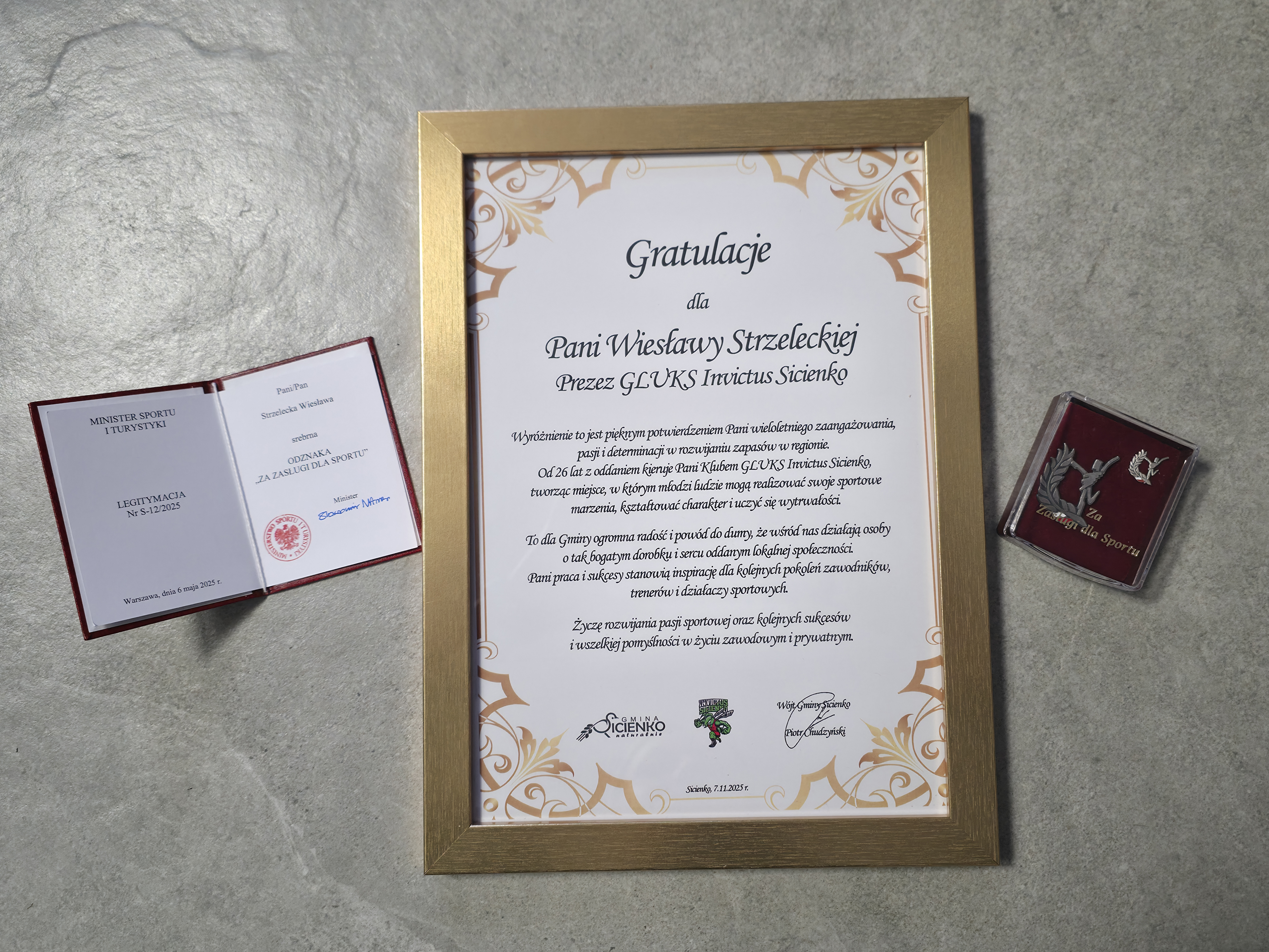 12 listopada Wójt Gminy Sicienko Piotr Chudzyński spotkał się z Panią Wiesławą Strzelecką – Prezes GLUKS Invictus Sicienko, by pogratulować jej otrzymania srebrnej odznaki Ministra Sportu i Turystyki „Za Zasługi dla Sportu” podczas piątkowej Gali Sportu Powiat Bydgoski.